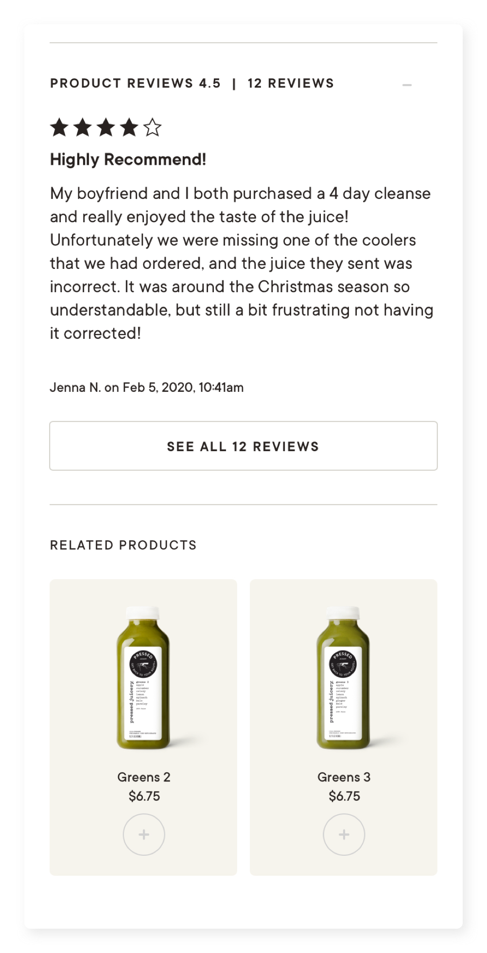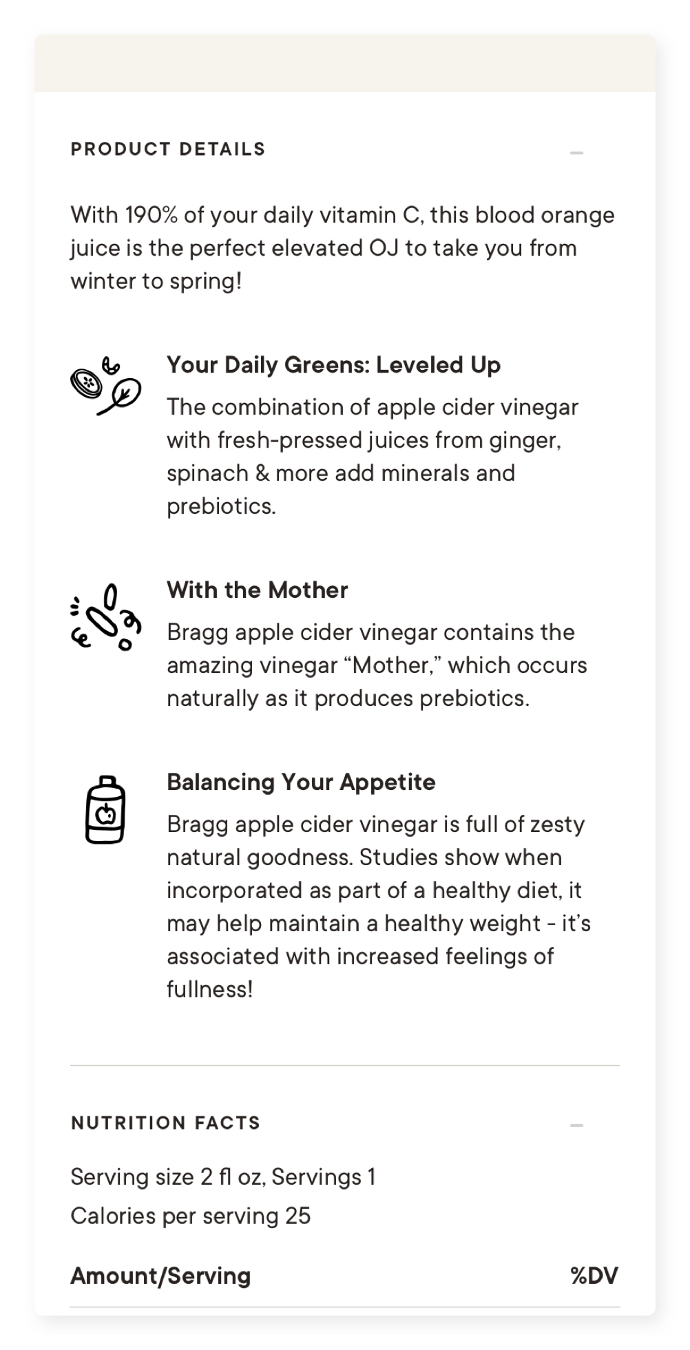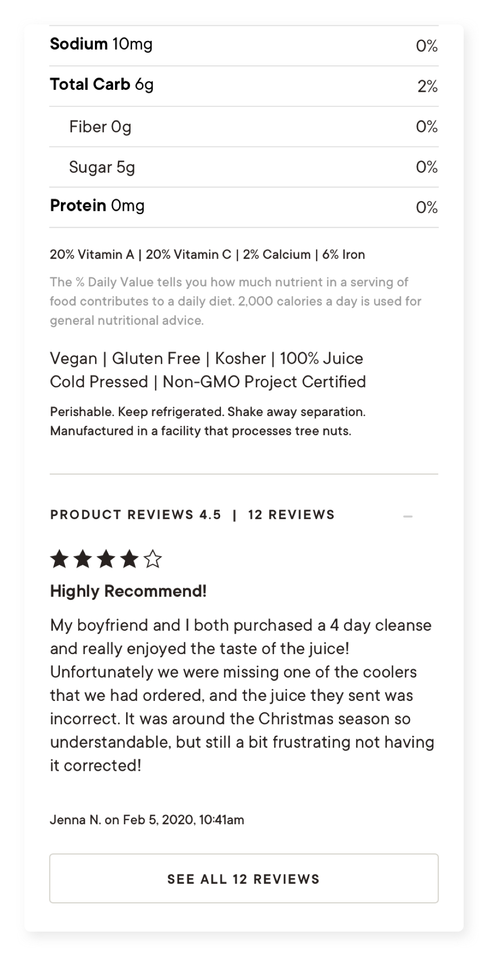The Shop begins with Featured Items, and rolls into Bundles. Based on market data, Bundles sell better than individual juices (which was a surprise to me, but the data doesn’t lie!). The hanging category menu was decidedly not necessary as scroll times didn’t justify real estate on the Shop Page.